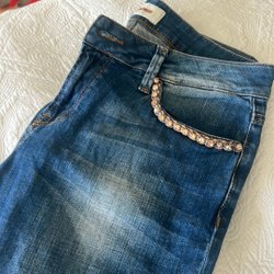 Helt nya slim jeans, stretch med fem fickor. Byxorna har en knapp och dragkedja framtill. Finns inga lappar på dom, för att jag köpte två lika, fast en mörkblå och en ljusare blå, men den ljusare var ändå en del mindre, trots samma storlek , men provade mörk.b först å antog att dom var lika i storlek, men tyvärr inte ??. Skulle ju ha sagt ifrån i butiken, men tänkte jag skulle komma i dom en dag, men tyvärr så blev det inte så ????. Det står 40, men passar nog bäst 38, detta är H&M. Kostar minst 400 ny.