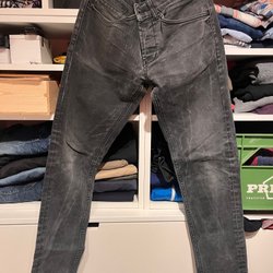 Svartgråa jeans, storlek 29/34. Små hål på bakficka och längst ner