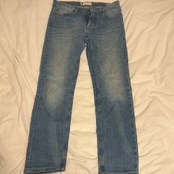 Ett par ljusblå jeans med klassisk design. Byxorna har en rak passform, stl 31/34