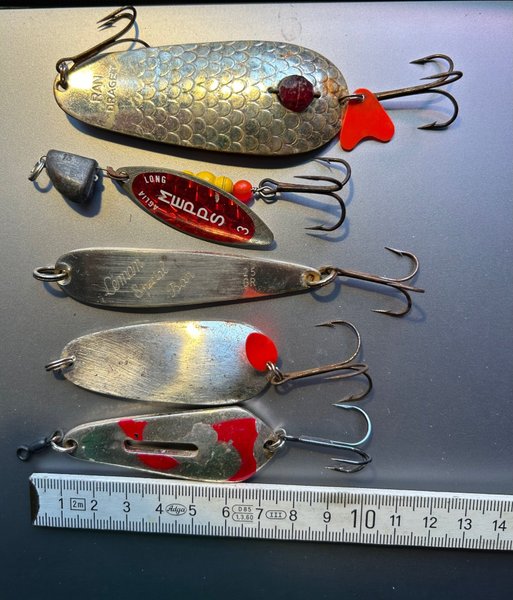 Fem olika fiskedrag i varierande storlekar.