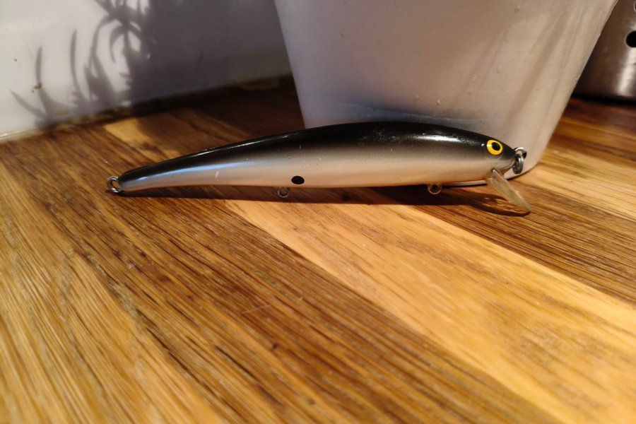Detta fiskedrag har en slank design med en svart och silverfärgad yta. Utrustad med en krok och en ögla för enkel upphängning. Passar för fiske i olika vattenmiljöer.