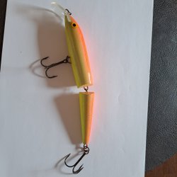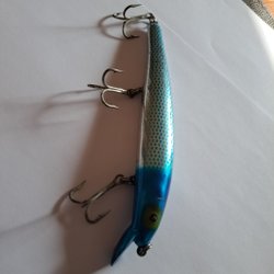 Ett plastfiskedrag med krok. Draget har en färgkombination av blått, gult och rött. Passar för fiske i sötvatten.