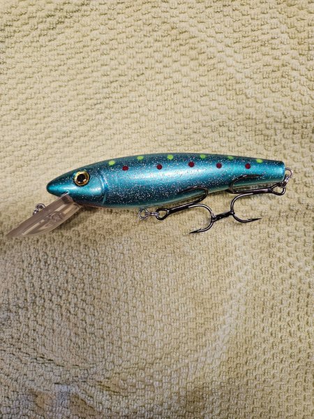 Wobbler 16 cm ca 35 gr. Egenmålad airbrusch. Krok 2/0. Fin gång lovas. Flytande, går ner 4-6 m vid trolling. Fin att kasta också. Samfraktar gärna