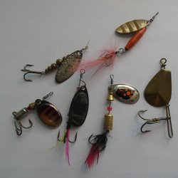 Detta fiskedrag är utrustat med en krok och en sked. Det har en kombination av olika material och färger som kan vara intressant för fiskeentusiaster.