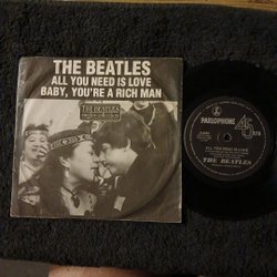 Singel med The Beatles, innehållande låtarna 'We Can Work It Out' och 'Day Tripper'. Utgiven på Parlophone. Cover Vg ++/ Rec excellent.
