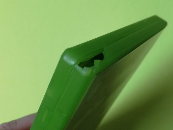 Notera att det är en skada på kanten av fodralet.