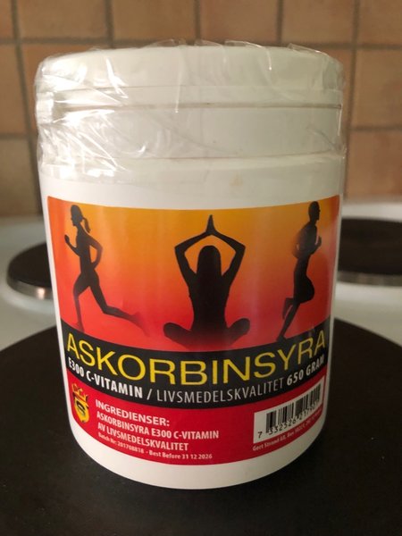 ASKORBINSYRA E300 C-VITAMIN av livsmedelskvalitet. Bäst före 31 Dec 2026