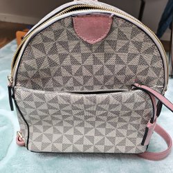 Ryggsäck i ljus färg med svarta detaljer. Den har ett lock med spänne och en liten ficka med dragkedja på framsidan. Insidan har ett fack och en dragsko.