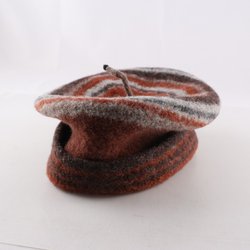 En handgjord, brun mössa. Den är virkad eller stickad i ett tätt mönster och har en mjuk, rundad form.