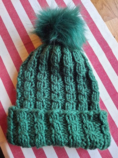 En grön stickad mössa med ett dekorativt mönster och en stor, fluffig tofs i fuskpäls. Mössan har en ribbstickad kant. Dam storlek.