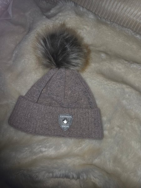 Detta är en stickad mössa i en ljus färg med en stor, fluffig tofs upptill. Mössan har ett uppvikt kantband och ett emblem med texten "CANADA SNOW" framtill.