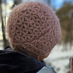En handstickad mössa i en ljusgrå /ljusblå och vitt nyans . Mössan har en ribbstickad kant 5 cm och har små genomskinliga paljetter 3 mm som ljuser diskret. Mössan är lätt, mjuk och varm!