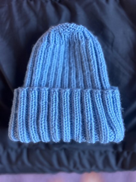 Ljusblå handstickade mössa (ull?)