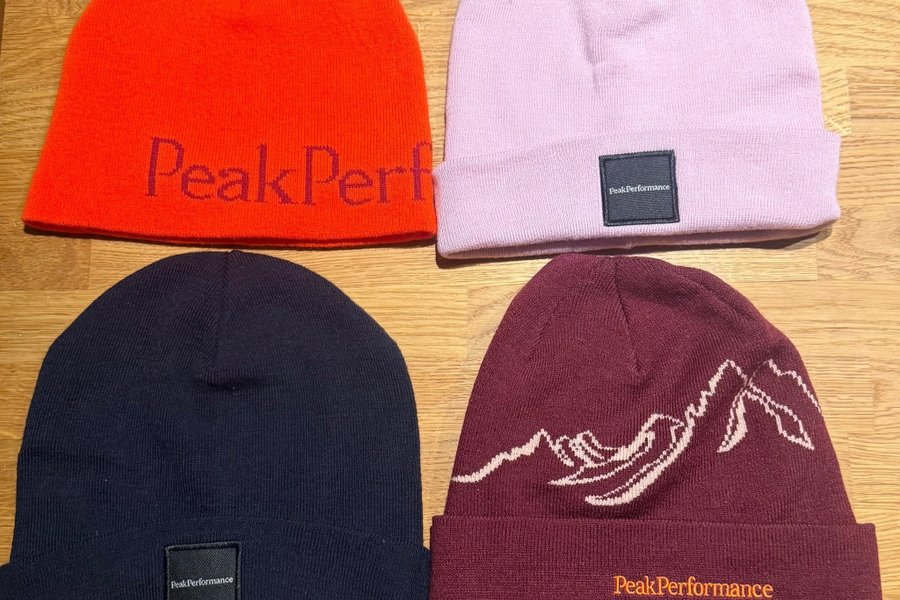 Fyra mössor från Peak Performance. En orange mössa med Peak Performance-logotypen invävd i tyget. En ljuslila mössa med en svart tygpatch med Peak Performance-logotypen. En mörkblå mössa med en svart tygpatch med Peak Performance-logotypen. En vinröd mössa med ett invävt bergsmönster och Peak Performance-logotypen broderad i orange.