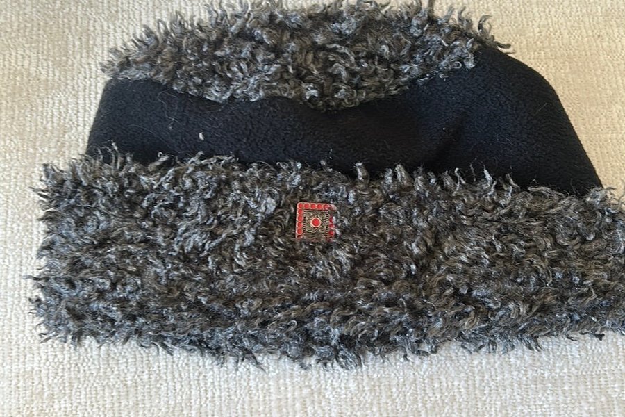 En svart mössa med grå detaljer och en liten röd och vit dekorativ detalj.