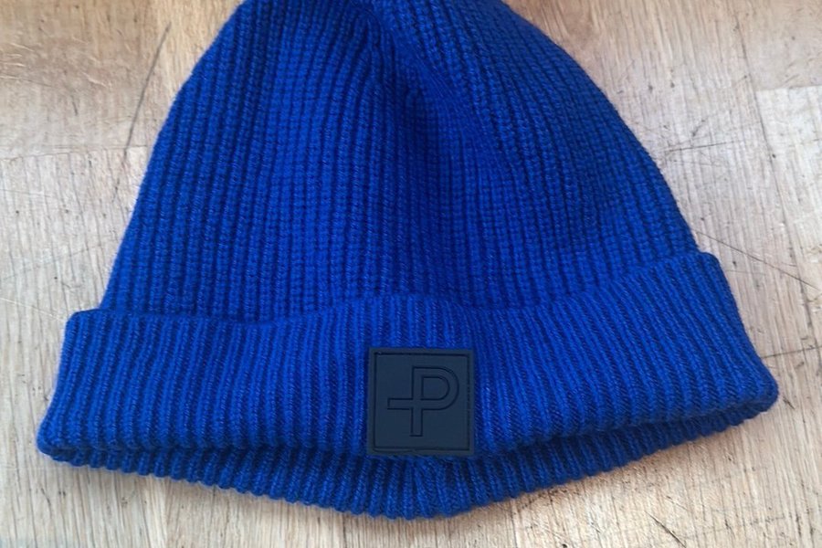 En blå stickad mössa med en svart fyrkantig logotyp på framsidan. Mössan har en ribbstickad design och en omvikt kant