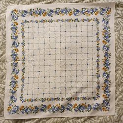 Blå mössa med röd, gul och vit tofs. Mössan har röda detaljer och en vit kant med gulfärgade dekorationer. Den har även ett band med tryckknapp för att fästa under hakan.