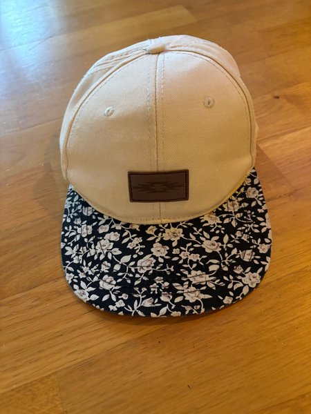 En beige keps med ett brunt märke framtill. Skärmen har ett blommigt mönster i svart och vitt. Storleken kan justeras baktill. Tvättad.