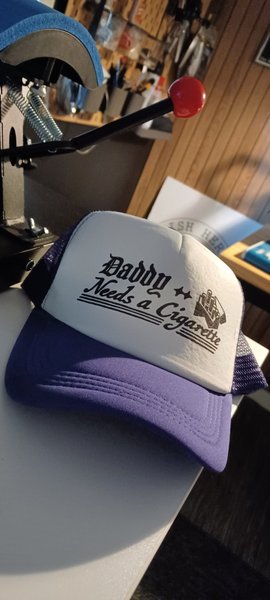 Keps med texten "Daddy Needs a Cigarette" och en bild på cigaretter. Kepsen har en vit front och lila skärm samt lila nät baktill.
