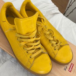 En gul keps från Dsquared2 med texten "ICON" tryckt i svart på framsidan. Kepsen har en justerbar rem baktill med texten "DEAN & DAN CATEN" broderad ovanför.