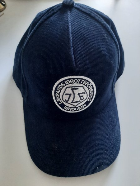 Mörkblå keps med en broderad logotyp framtill. Logotypen är rund med texten "LEKSANDS IDROTTSFÖRENING" och "ISHOCKEY" runt en stiliserad bokstavskombination i mitten.