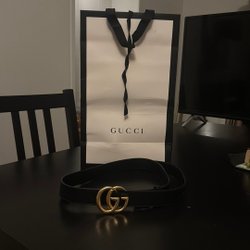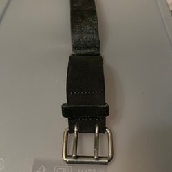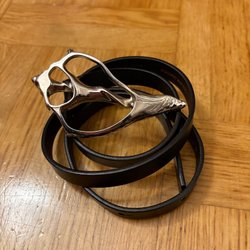 Ett svart bälte med ett silverfärgat spänne. Bältet är rullat ihop och hålls av en hand.