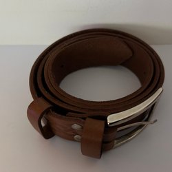 Ett brunt läderbälte med ett rektangulärt spänne i mässing.