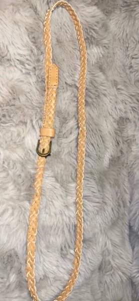 Ett flätat bälte i en beige nyans med ett spänne i metall. Bältet har en smal design.
