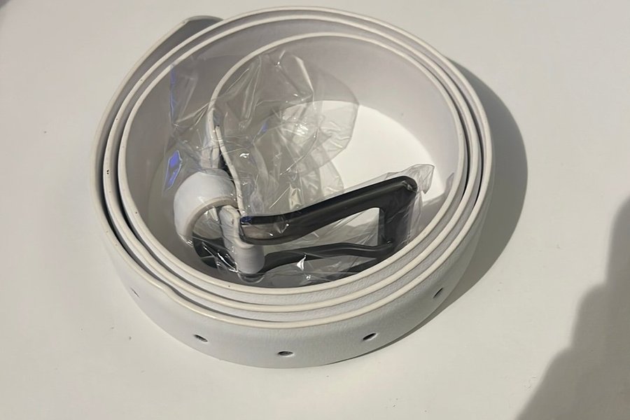 Vitt bälte med ett svart spänne. Bältet är rullat ihop och spännet är inplastat.