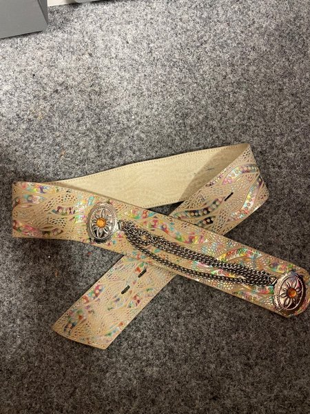 Ett bälte med ett unikt mönster i olika färger. Bältet har dekorativa metallspännen med en orange sten i mitten och en kedja som förbinder dem.