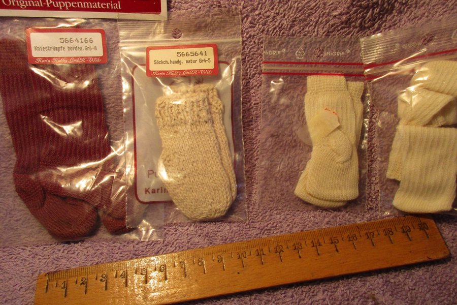 Fyra par dockstrumpor. Ett par är knästrumpor i bordeaux, storlek 6-8. Ett par är handgjorda sockor i naturfärg, storlek 4-5. De andra två paren är vita sockor.