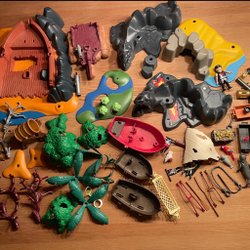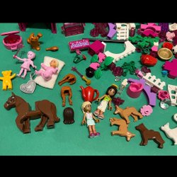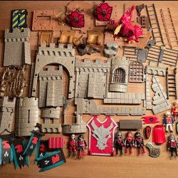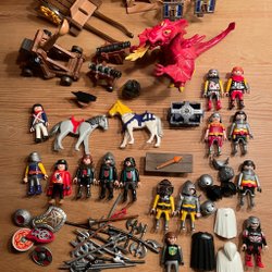 Lego i blandade bitar, figurer och tillbehör. Innehåller bland annat basplattor, hästar, vagn, riddare och verktyg.