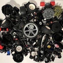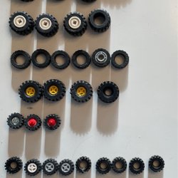Ett stort sortiment av Lego hjul och däck i olika storlekar och utföranden. Perfekt för att bygga fordon och andra kreativa konstruktioner. Innehåller både kompletta hjul och lösa däck.