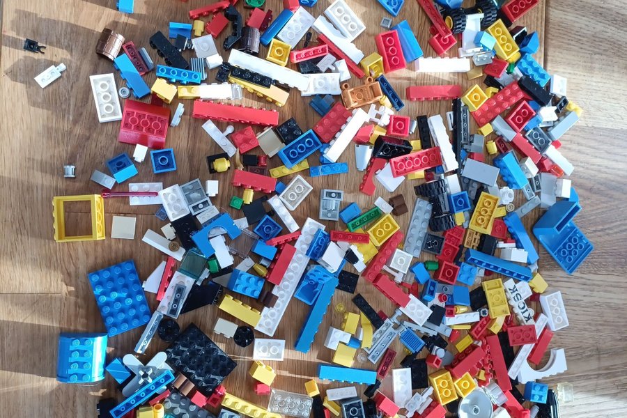 Blandade Lego bitar i olika färger och former. Massa specialbitar. Några bitar är äldre, lite blekta och skavda. Men alla är äkta, hela och nytvättade i maskin.