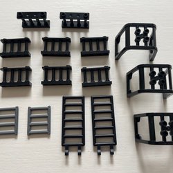 Dette parti indeholder et udvalg af LEGO dele, herunder grå plader, skrå elementer, gennemsigtige brune elementer, en hvid plade, sorte stænger og en hvid kontrolpanel-klods.