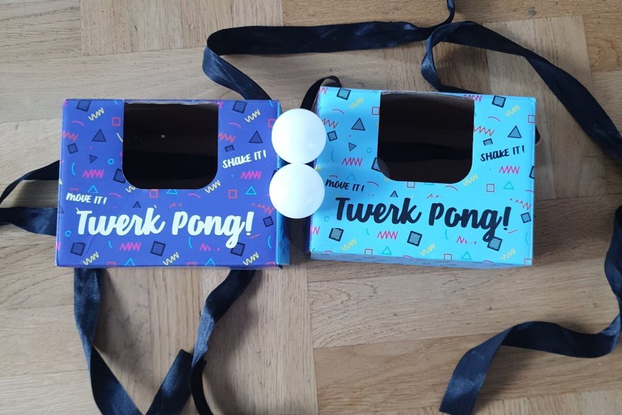 Rolig twerkspel för två barn. Man knyter boxarna runt midjan så att de hänger på rumpan och tävlar i vem twerkar bättre så att bollarna ramlar ut ur boxen.
