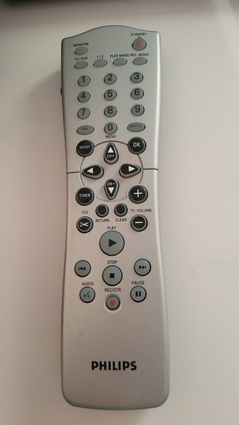 Fjärrkontroll från Philips. Denna fjärrkontroll har knappar för TV/DVD, Monitor, Play Mode, Rec. Mode, Standby, T/C, Disc, System, Menu, Select, OK, CH+, CH-, Timer, FSS, Return, Clear, Play, Stop, Audio, Rec/OTR, Pause, TV Volume samt numeriska knappar 0-9.