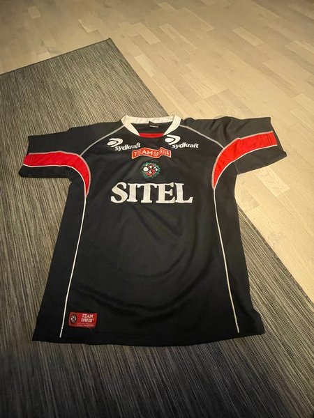 Svart tröja med röda och vita detaljer. Tröjan har tryck framtill med texten "SITEL" i vitt, "TEAM SPORTIA" i rött och "Sydkraft" i vitt på båda sidor av kragen. Det finns även en logotyp med ett fotbollsliknande mönster i grönt, rött och vitt under "TEAM SPORTIA". En liten röd etikett med "TEAM SPORTIA" och en logotyp finns nedtill på tröjan.