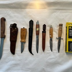 Tre knivar med röda och orange handtag. Dom har använts till fiske men dom får hitta ett nytt hem nu. Till dom som är intresserade och vill väsa osv.
