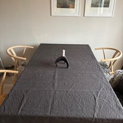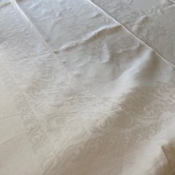 Superfin duk i halvlinne (59% bomull, 41% linne) med ett vackert mönster och fin lyster.  Etikett med ”Swedish design KL” (Klässbols?). Minns dock att den var från ett av våra finare linneväverier. Legat i skyddande original-påse sedan inköpet. Aldrig använd!