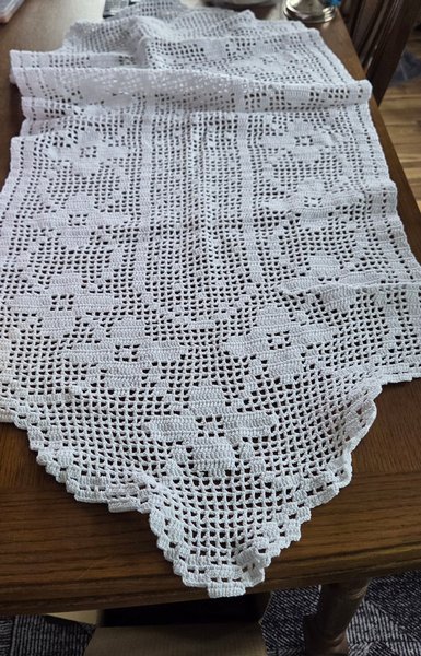 Vit virkad ostruken duk med mönster.