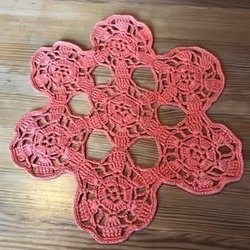 Virkad duk i vitt och orange. Virkad i bomullgar