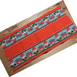 Handvävd duk en löpare, med ränder i rött, svart och naturfärg med fransar. Ett hörn har släppt lite se bild.