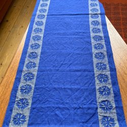 Vacker, lång bordslöpare i en djupblå färg med intrikata mönster och dekorativa fransar.
