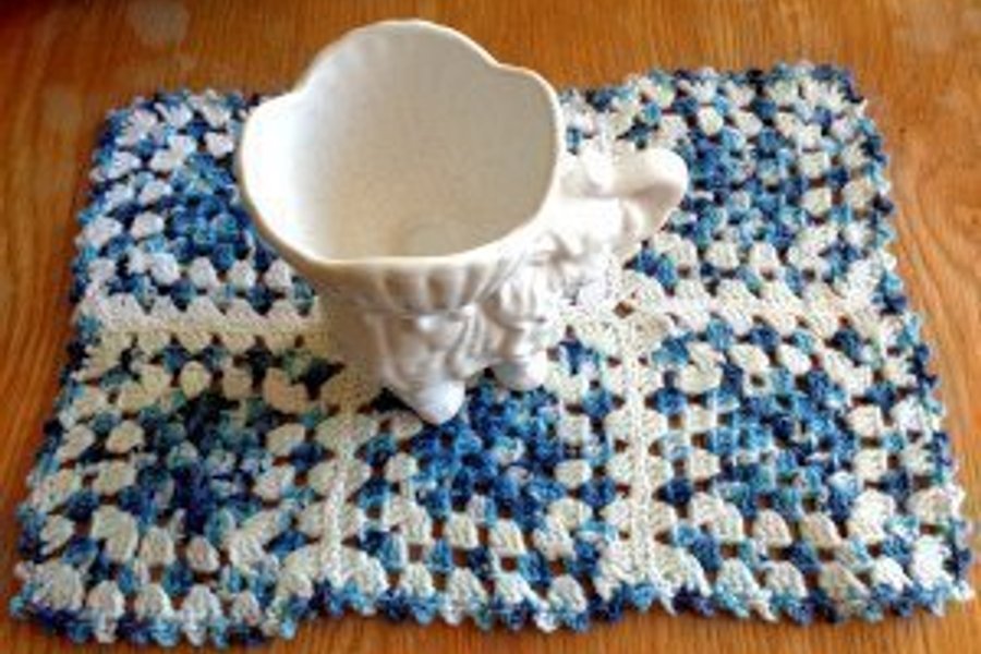 En lite annorlunda löpare virkad i acryl. Färgerna är vitt och blåmelerat och storleken ca 40x27 cm.