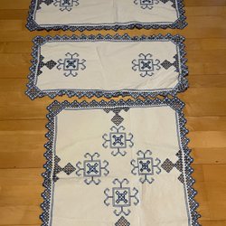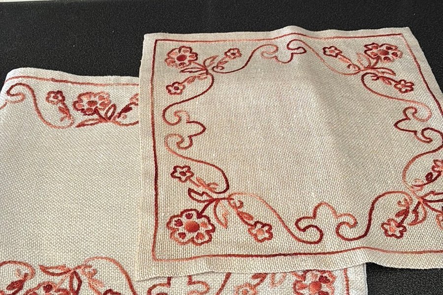 Två stycken broderade dukar med blommönster. En något mörkare i färgen. En avlång och en fyrkantig.