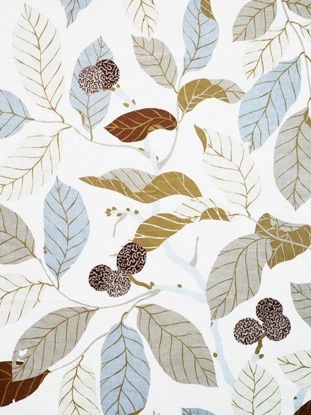IKEA 1 gardinlängd BLAD design Maria Åström. Valnötsgrenar m löv och nötter i mönstret, beige/grå toner.