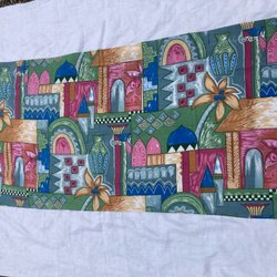 Gardinkappa med ett rutigt mönster i rött, beige och brunt. Den har en röd dekorativ vågig detalj. Ofållade kortsidor vilket får mig att misstänka att den är oanvänd.