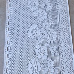 Vackert broderat tyg med intrikata mönster. Broderiet har detaljerade blad- och blommotiv, samt ett rutmönster som ger textur. Kanten är scalloperad med små utskurna detaljer.