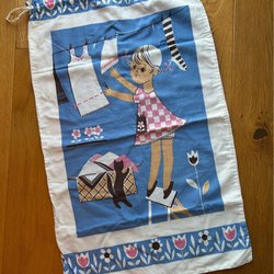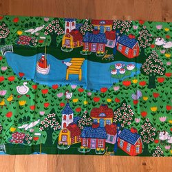 Två längder. Ca 40 cm bred ca 198 cm lång. Kan användas som panelgardiner eller borsdslöpare. Fållade upptill och nertill samt på sidorna. Myckets fint skick.